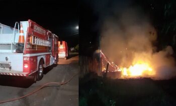 O Corpo de Bombeiros foi acionado e estava no local para conter as chamas do imóvel que era de madeira.