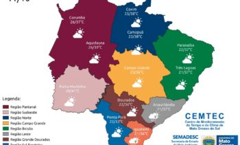 Na região pantaneira, Corumbá terá mínima de 26°C e máxima de 37°C, enquanto em Aquidauana, os termômetros devem variar entre 26°C e 39°C. Na região sudoeste, Porto Murtinho pode atingir 41°C, temperatura mais alta do dia, com mínima de 28°C.